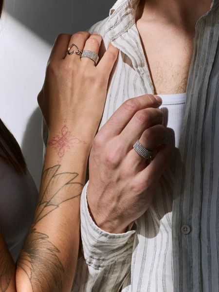 Еще один вариант базового украшения на каждый день: простое кольцо с легкостью впишется в образ и не будет мешать любым, даже самым активным движениям. Остается только определиться с текстурой — классической глянцевой, лаконичной матовой или характерной битой. Все варианты для вас и для вашего получателя!