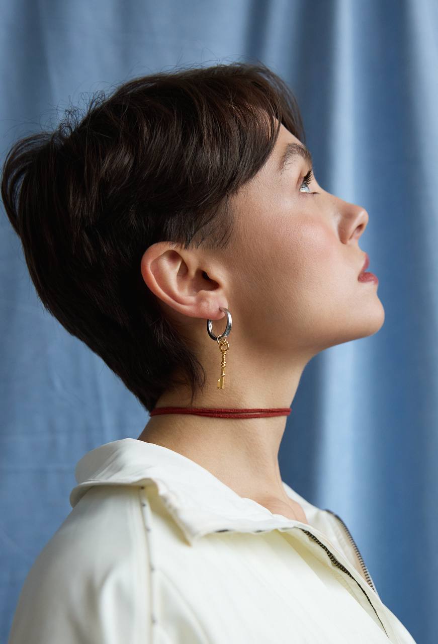 Ключик стал минималистичной подвеской в трех базовых оттенках: классическом серебряном, теплом золотом и характерном черном. Подвеску можно носить как на цепочке и бархатном шнурке, так и на серьге или браслете.