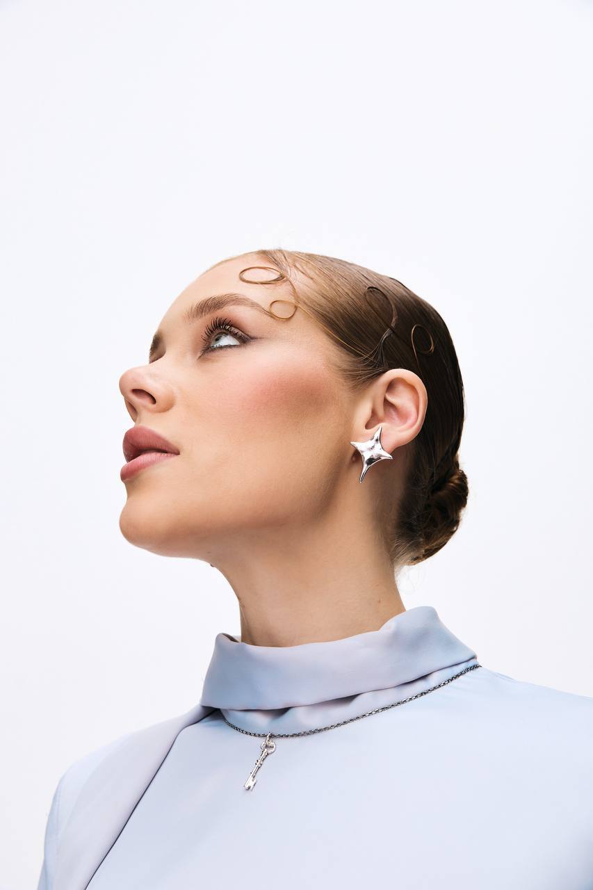 Серебряная звезда превратилась в несколько украшений: кафф и моносерьгу, кольцо на верхнюю фалангу и подвеску. Из них можно составить стильный комплект — или сочетать с другими любимыми украшениями. Скопление сказочных звезд стало лаконичной моносерьгой классического серебряного оттенка, а название коллекции нашло свое отражение в стильном медальоне: с гравировкой, любимой многими текстурой слияния и замочной скважиной.
