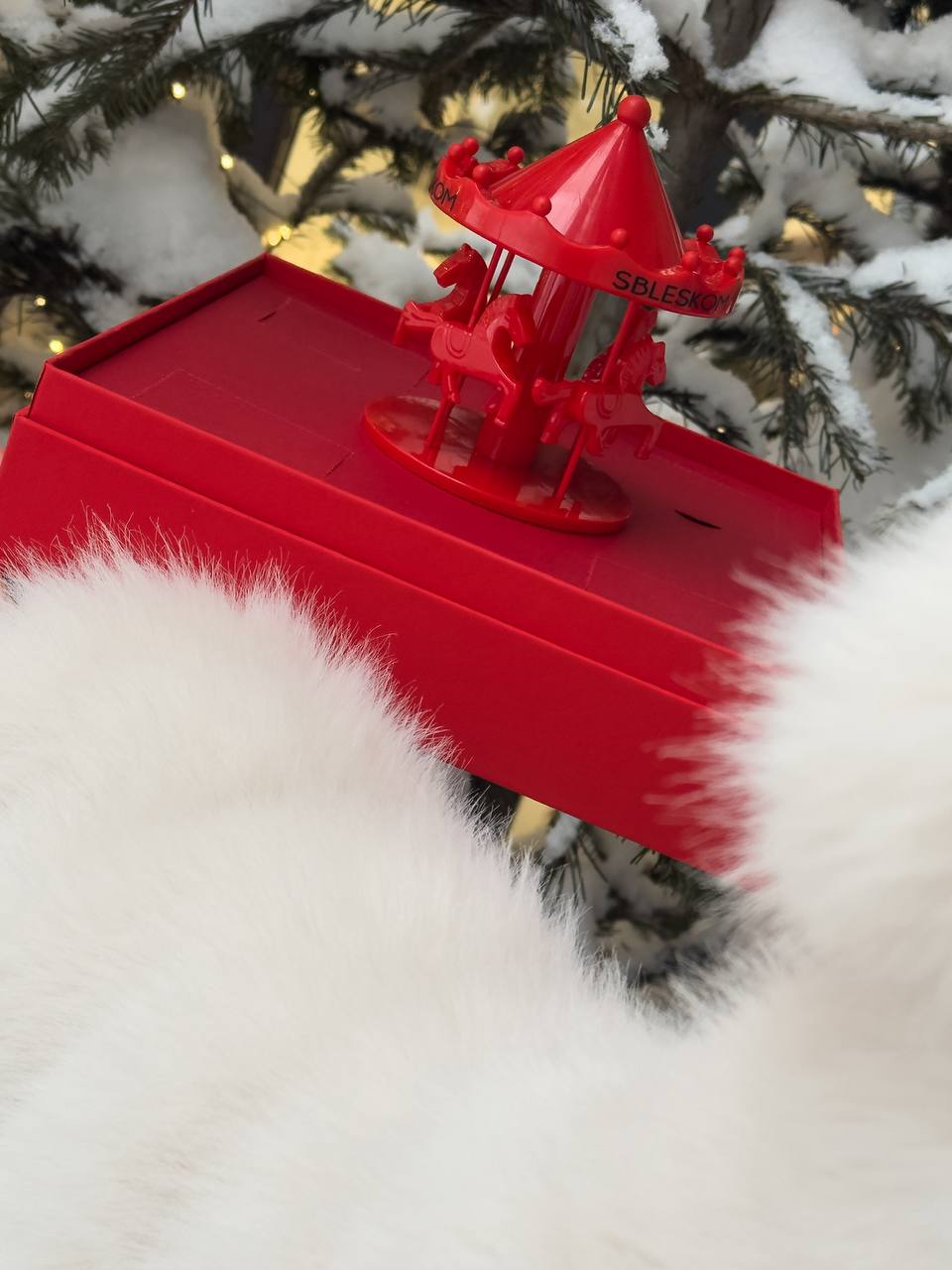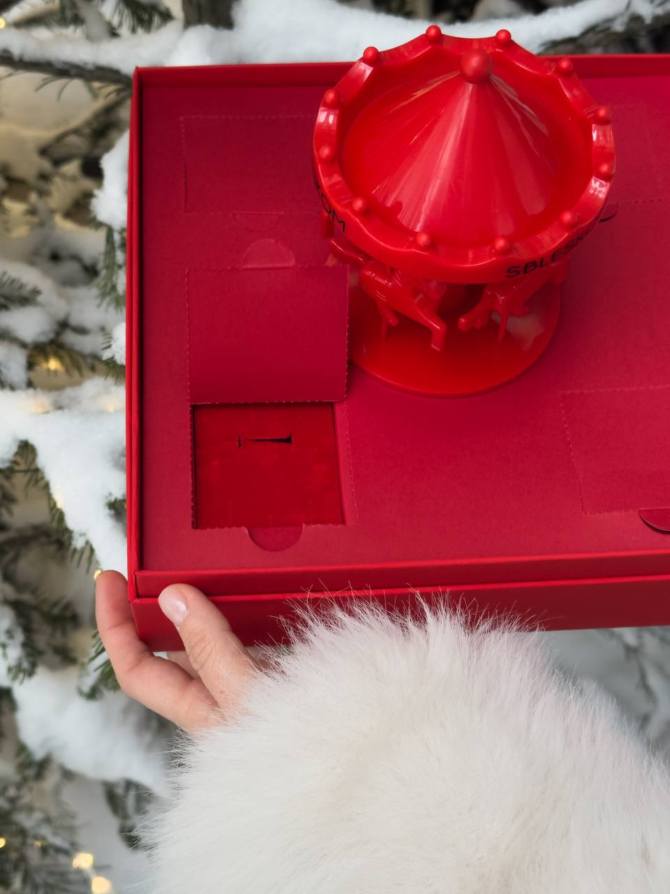 В боксе — 4 окошка, в которых вы можете спрятать коробочки с украшениями, а также центральный элемент — музыкальная крутящаяся карусель, которая зарядит получателя волшебным настроением.