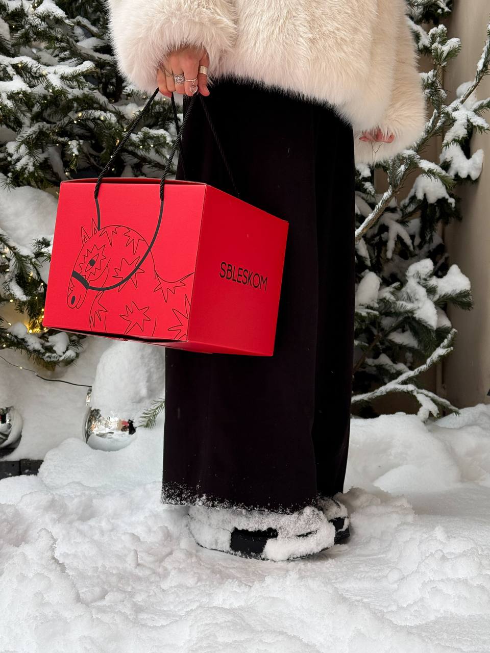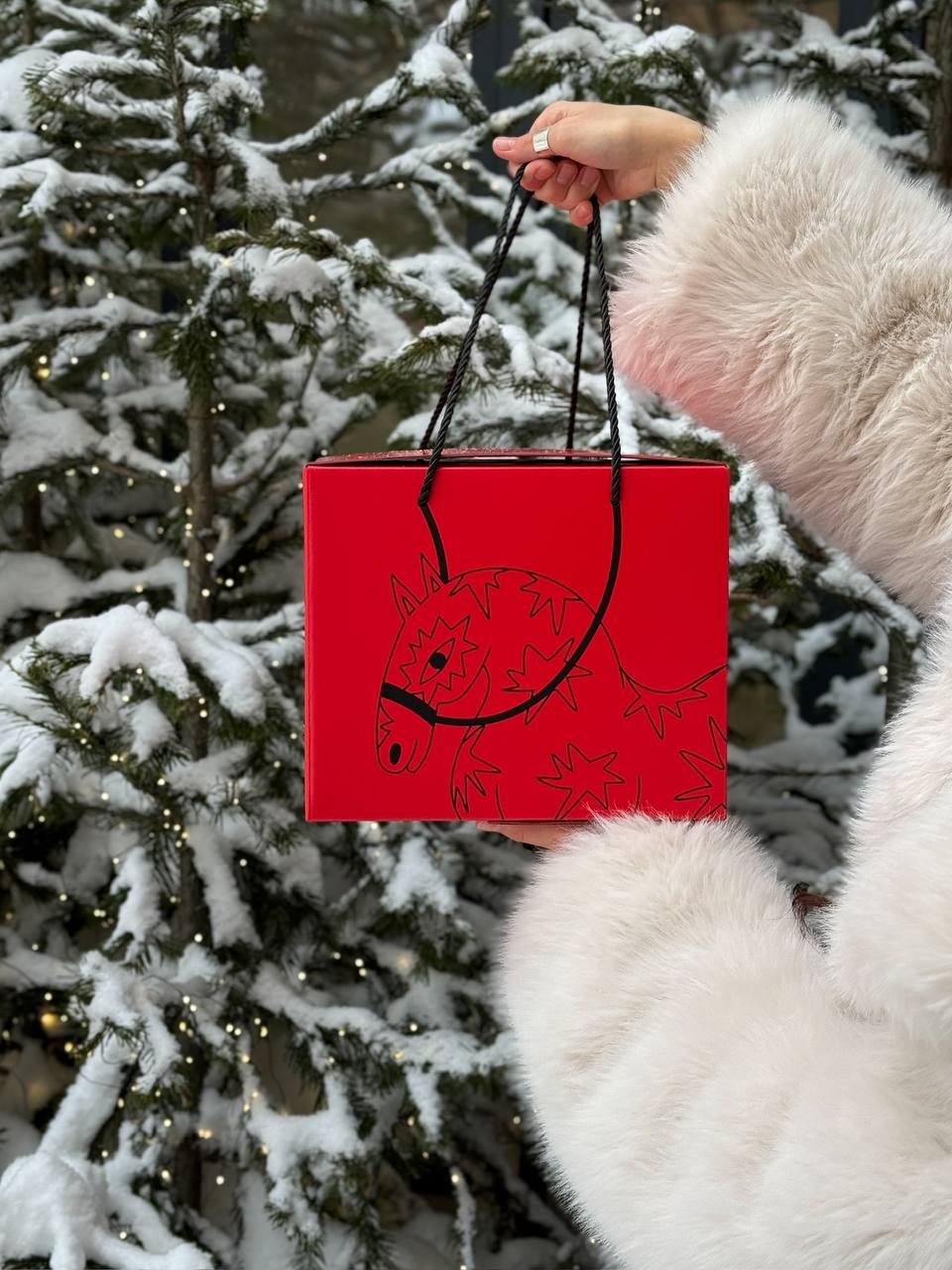Стильный бокс насыщенного красного цвета с авторскими иллюстрациями символа 2026 года: идеальная упаковка для ваших блестящих подарков!