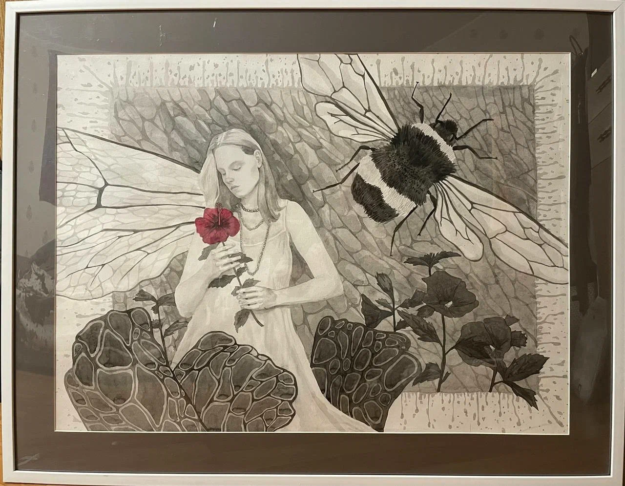 Жить в мире с собой - это замечать прекрасное в природе и в себе. Всем прекрасно известно, что девушкам идут украшения и цветы, которые только подчёркивают их красоту. Вот и на этой работе я изобразила свой автопортрет в цветах и на фоне напоминающем природный рельеф, а шмель стал воплощением стойкости характера и стремления к свободе.