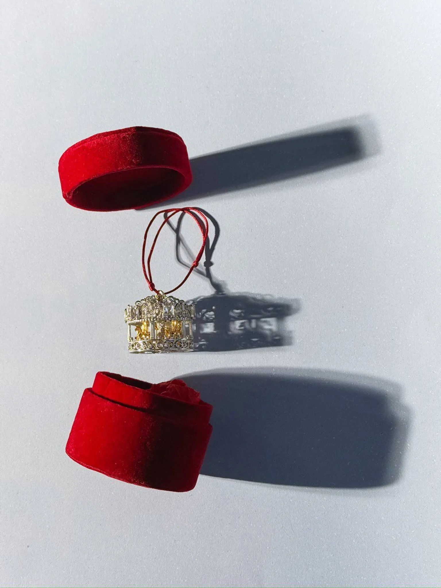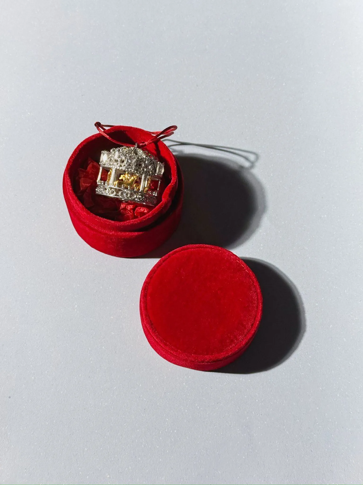 Елочная игрушка с символом года Лошади выполнена в виде сказочной карусели, сотканной из резного серебряного кружева с инкрустацией прозрачного горного хрусталя. В её деталях объединены грациозные лошадки и мотивы деревянного зодчества, подчёркивая наш культурный код. Золотые лошадки готовы отправиться в путь — стоит только слегка покрутить карусель!
