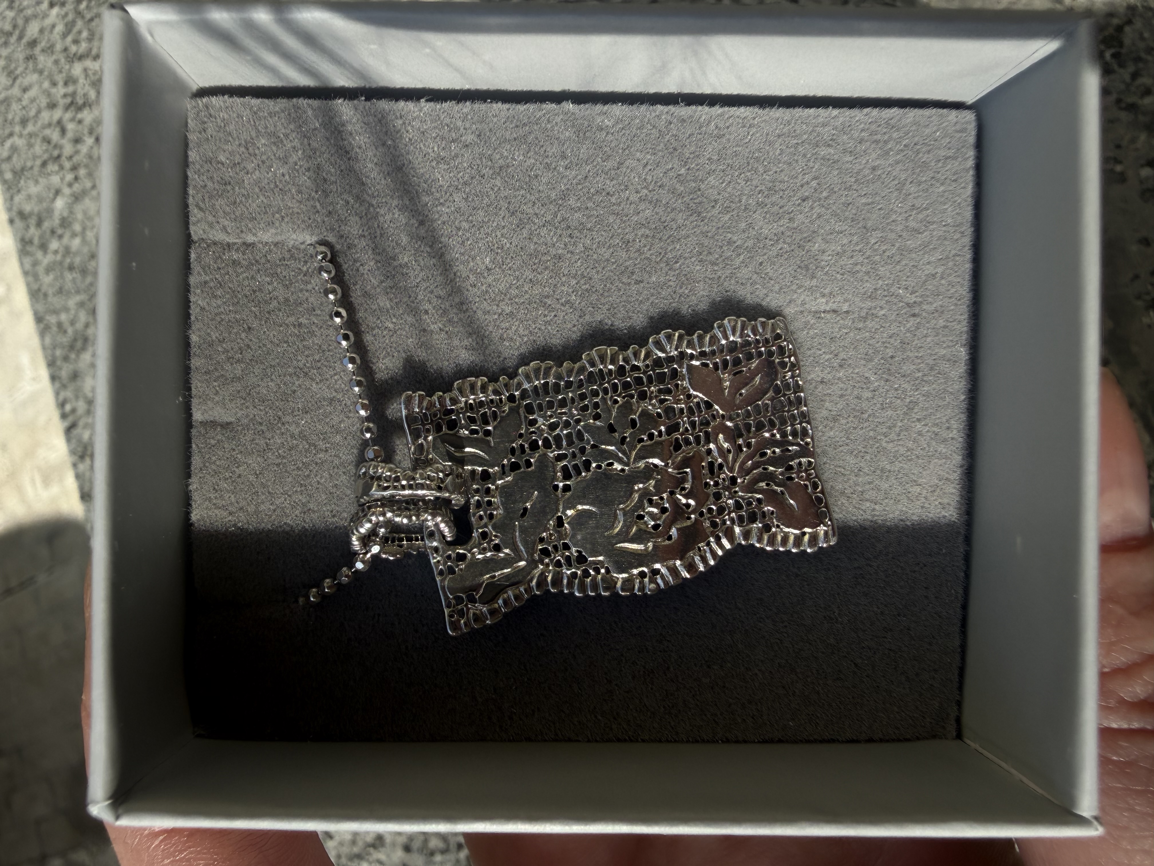 Подвеска в виде кусочка винтажного кружева — идеальная деталь для романтичных и воздушных образов. Сочетайте ее с легкими платьями или строгими костюмами, базовыми футболками или расслабленными свитшотами. Образ в любом стиле достоин нотки нежности и эстетики!