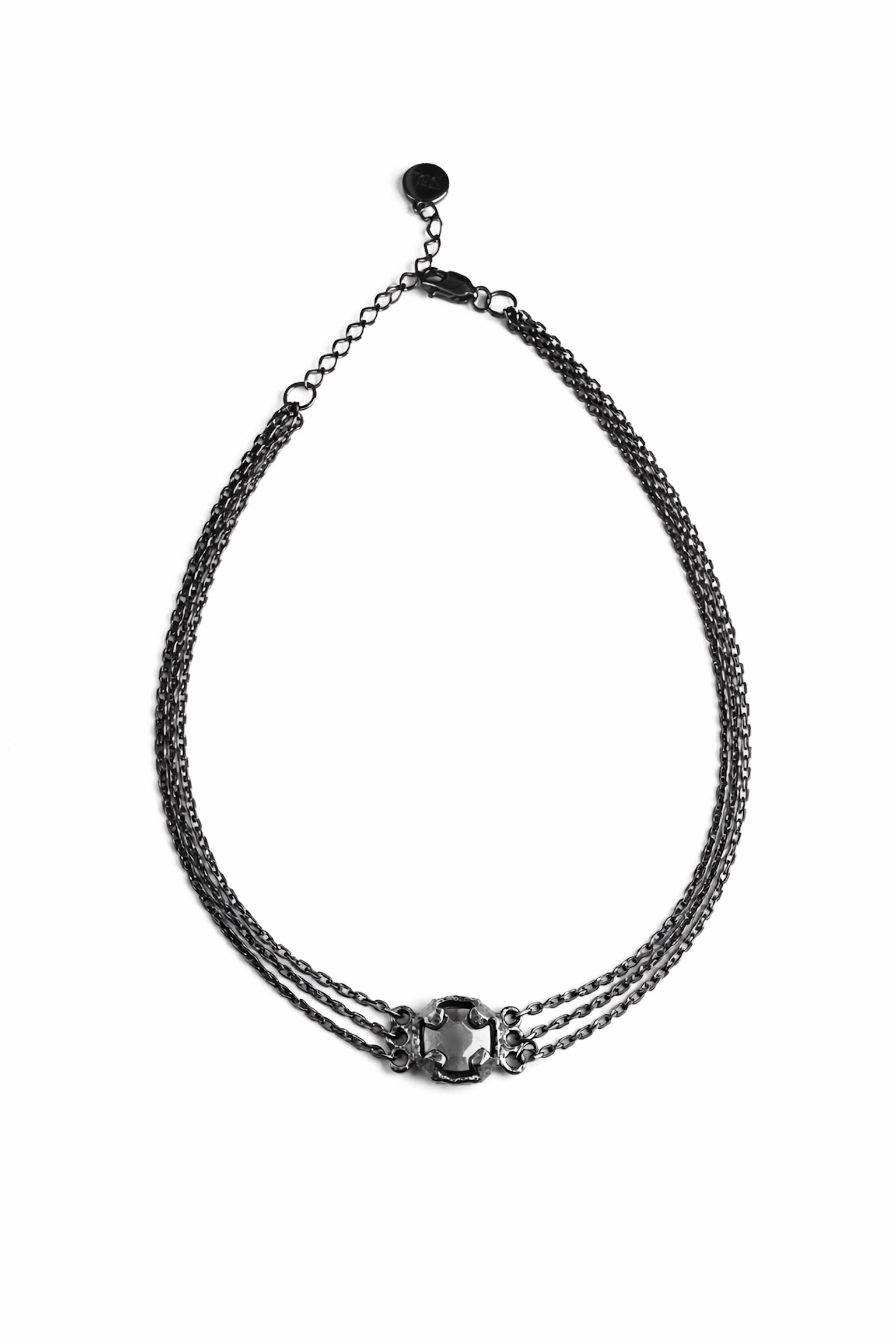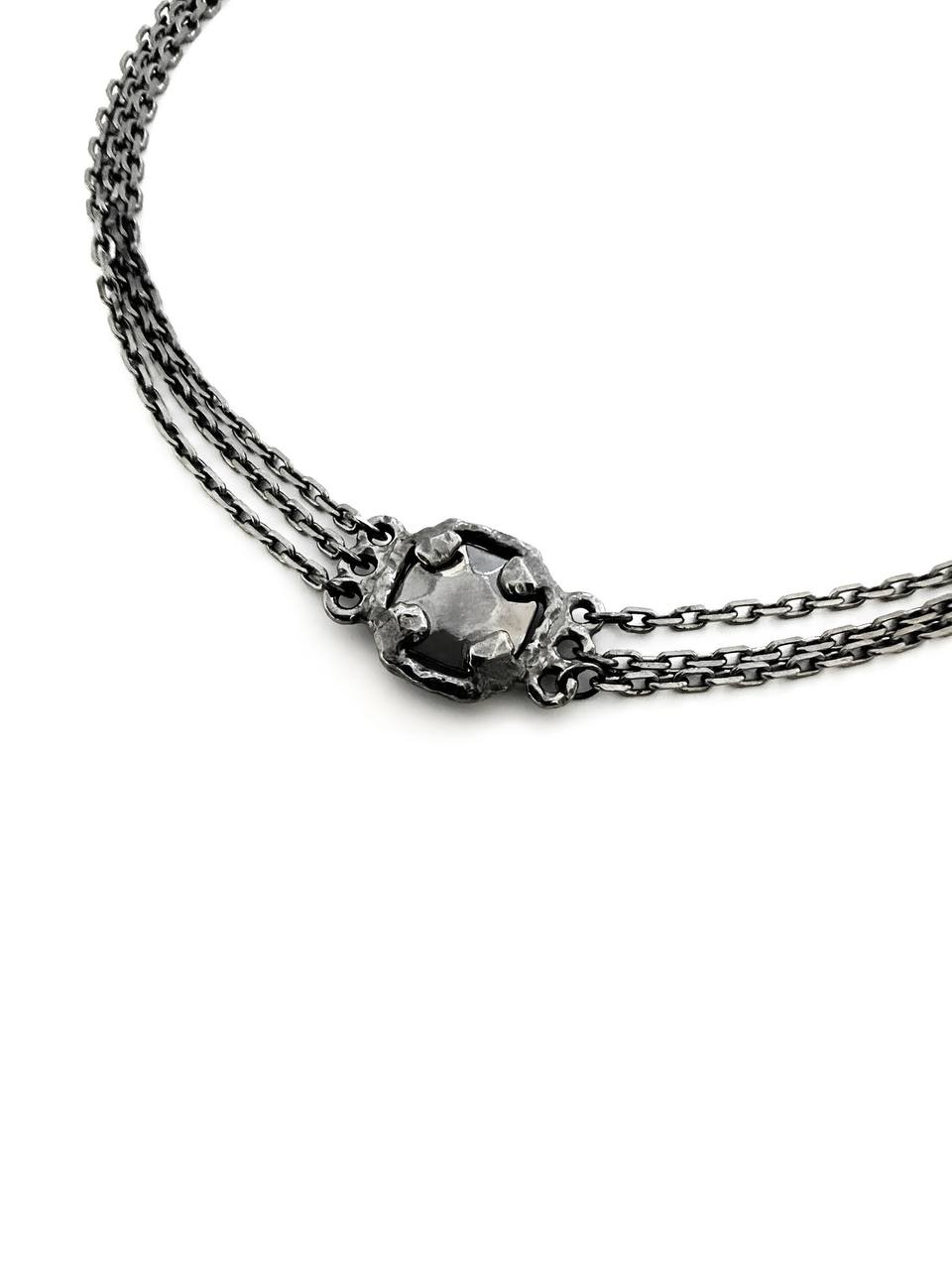 Объединили несколько цепочек и каст характерного черного оттенка, чтобы получить колье, прекрасное в своей простоте.