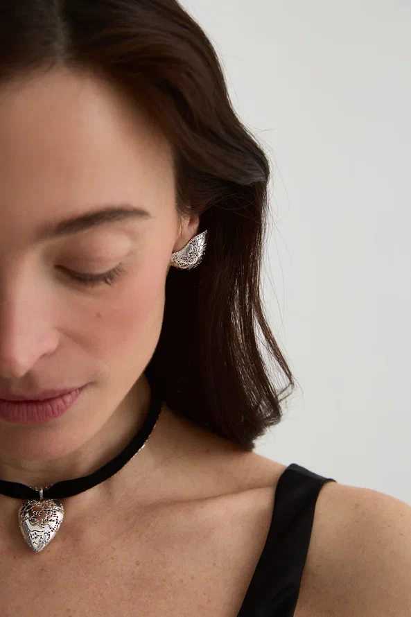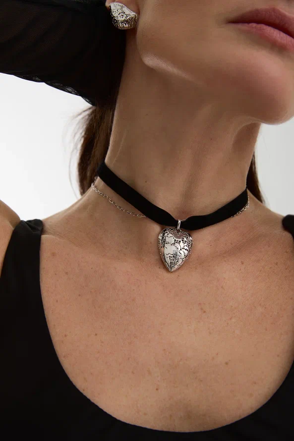 Сплели из тонкого серебряного кружева сердце, которое говорит о любви самым стильным способом. Лаконичная подвеска с мягким свечением серебра станет хранителем главного в мире слова, а мягкая бархатная лента добавит в образ интересных деталей.