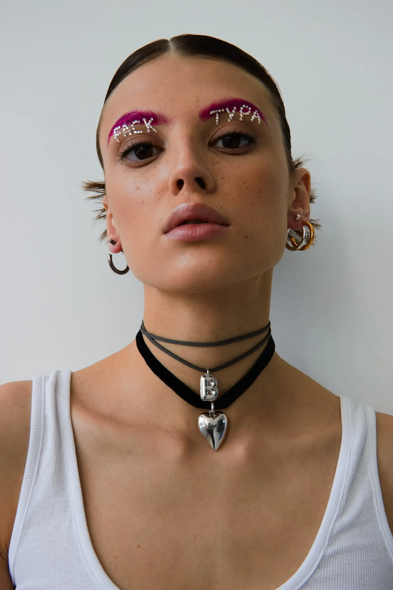 Колье, которое говорит о любви самым стильным способом. Лаконичная подвеска с мягким свечением серебра станет хранителем главного в мире слова, а мягкая бархатная лента добавит в образ интересных деталей.