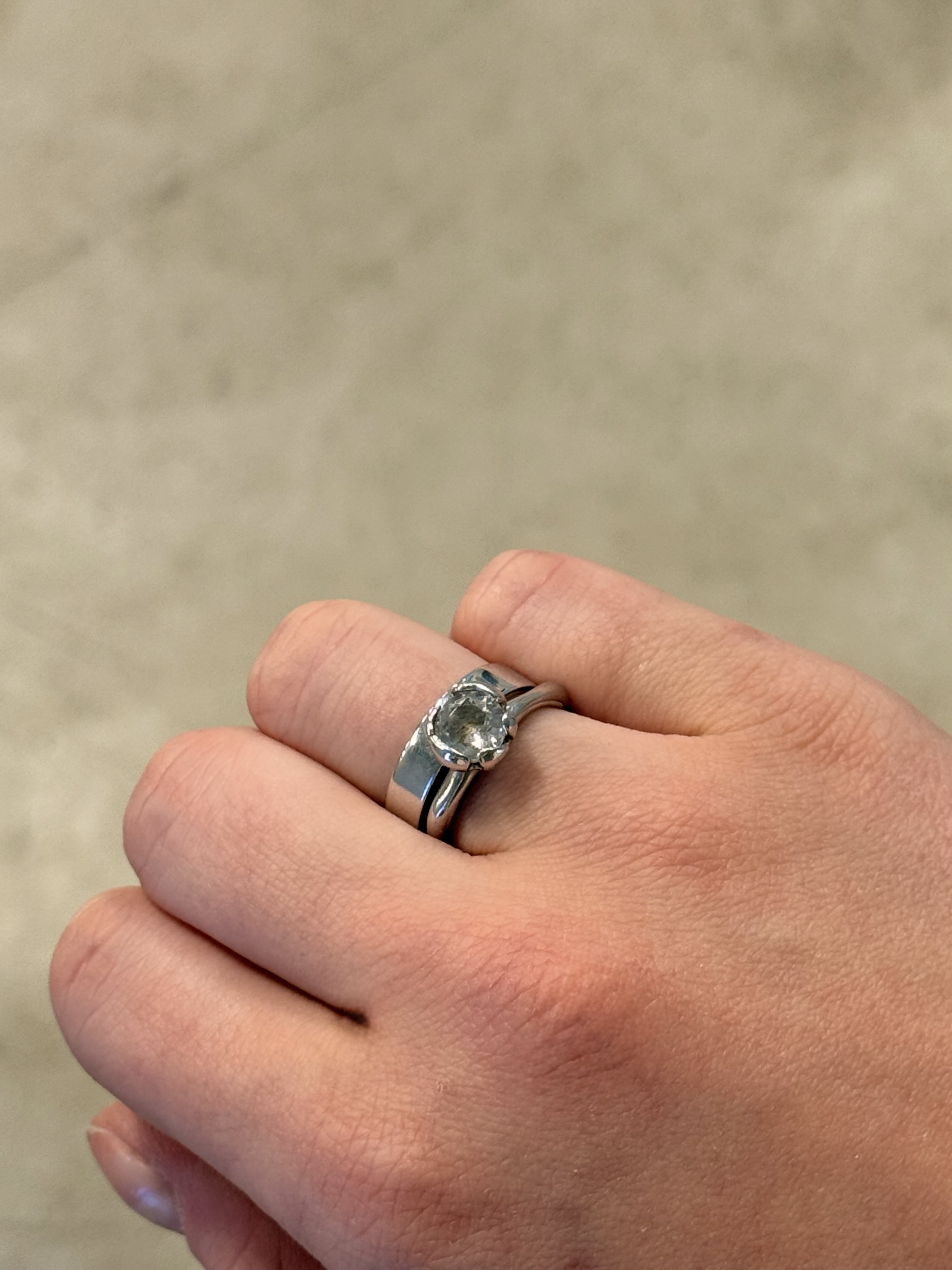 Хрупкая серебристая кувшинка, внутри которой спрятана бесконечная прозрачность горного хрусталя. «Поймали» цветок на кольцо и не можем перестать любоваться получившимся украшением: очень нежным и романтичным.