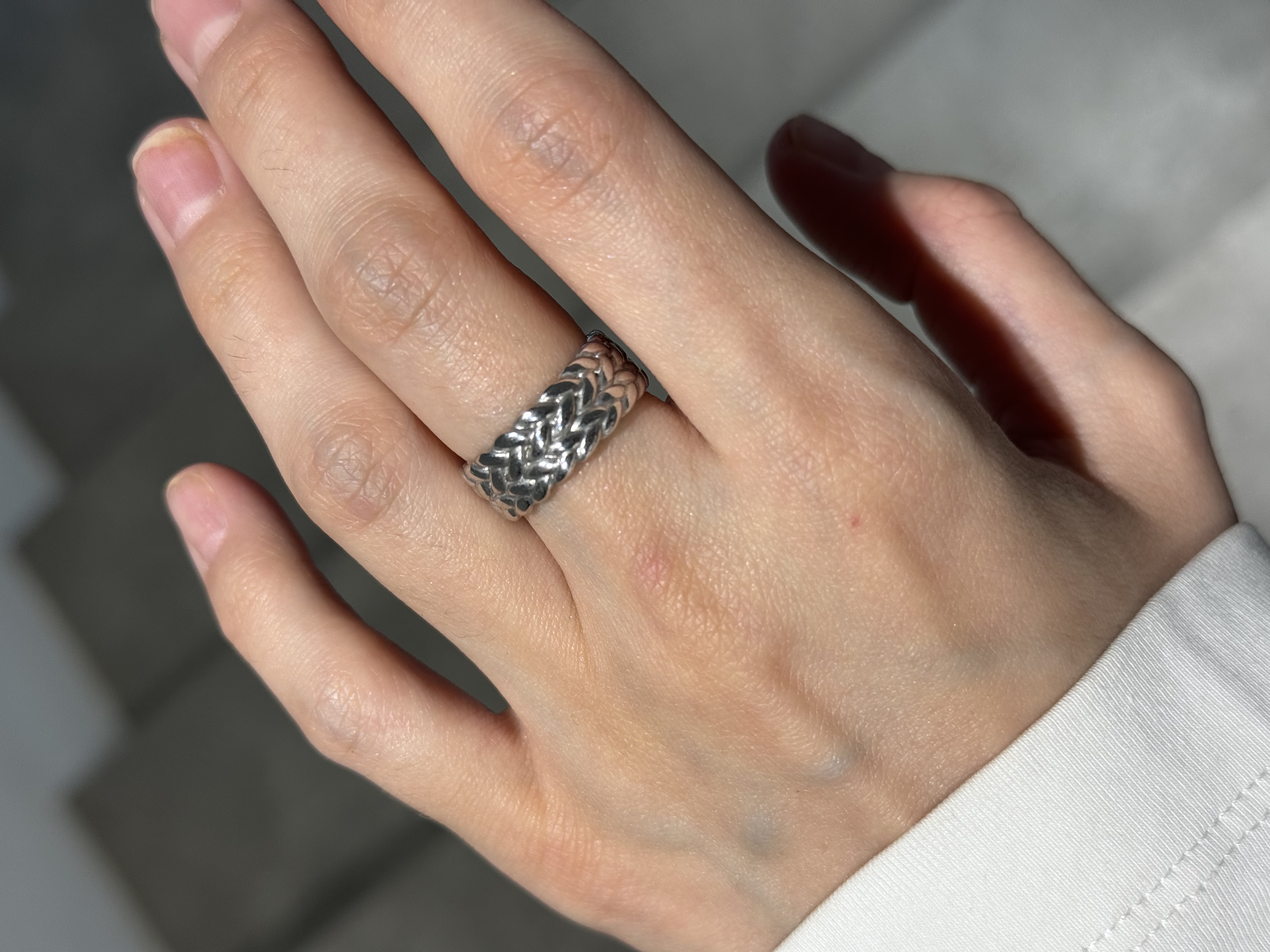 Сплели из серебряных нитей две тугие косы, превратившиеся в лаконичное кольцо, подходящее как для каждого дня, так и для особого случая.