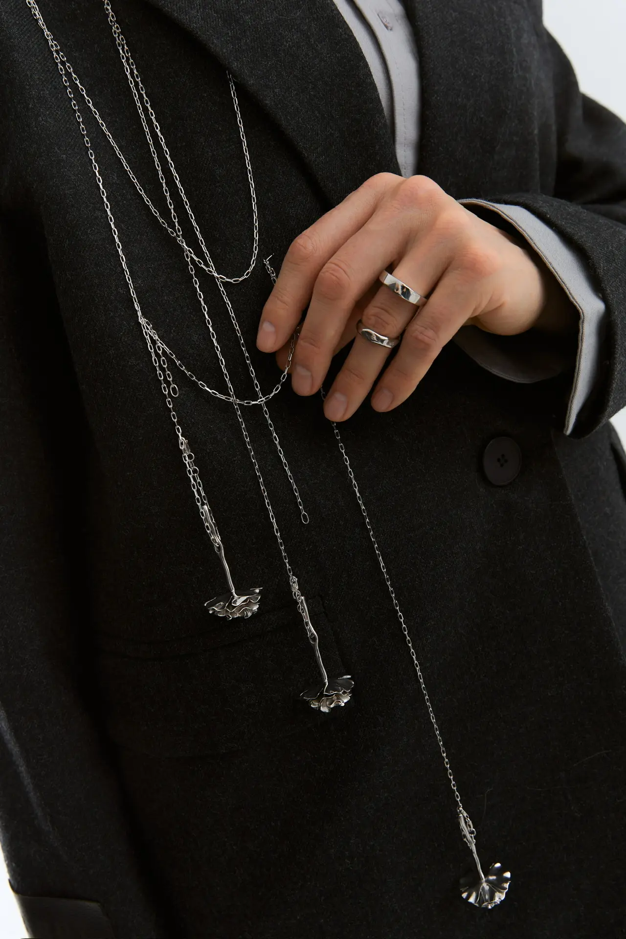 Лаконичное серебряное кольцо с характерными гранями — основа минималистичных сетов, для которых не нужен особенный повод.