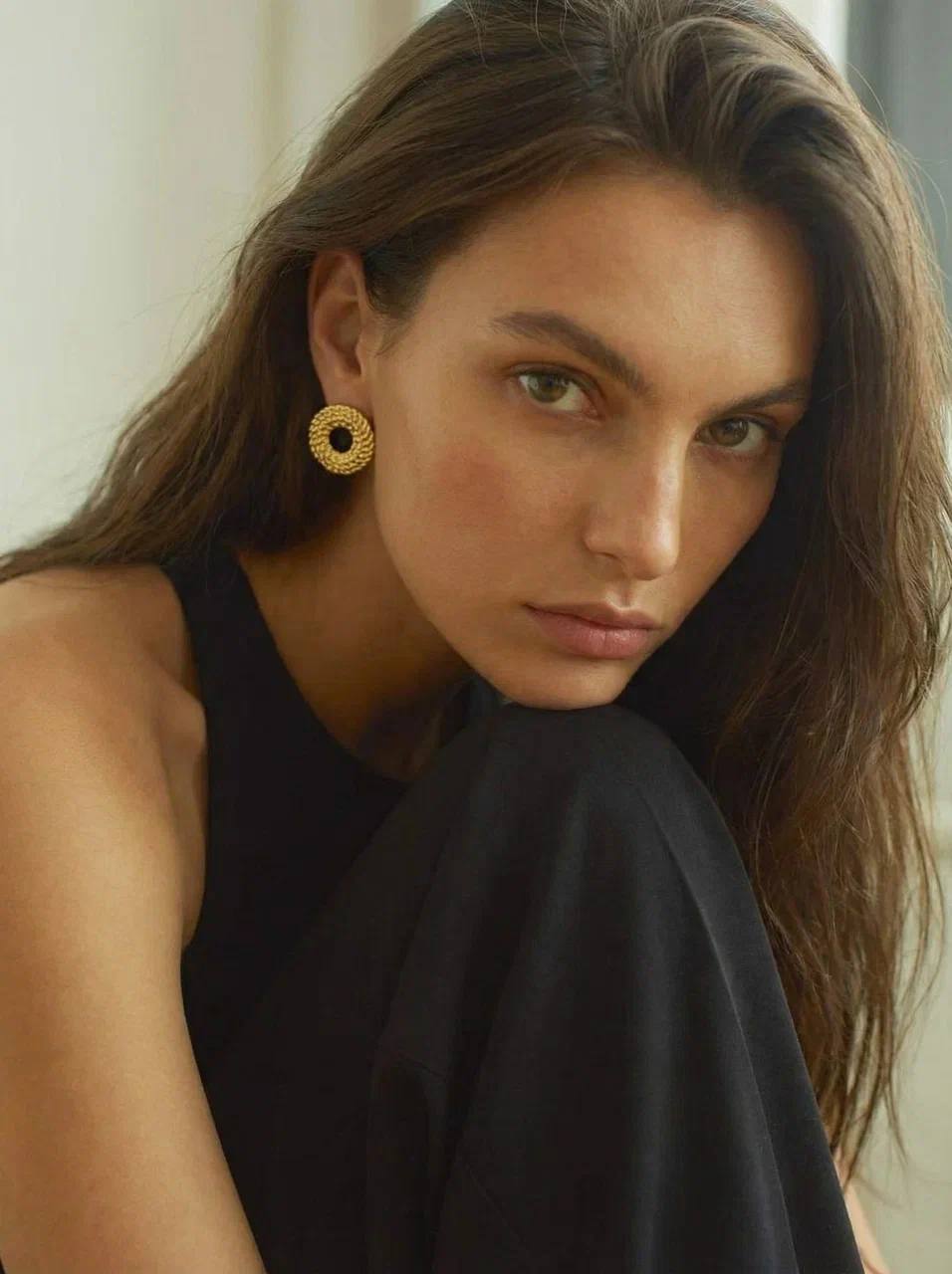 Классические круглые пусеты теплого золотого оттенка с фактурой, в которой каждый может увидеть что-то свое: косички, заплетенные мамой перед школой, салфетка, купленная на кухню мечты. А мы видим в ней удивительный узор, появляющийся с каждым новым переплетением.