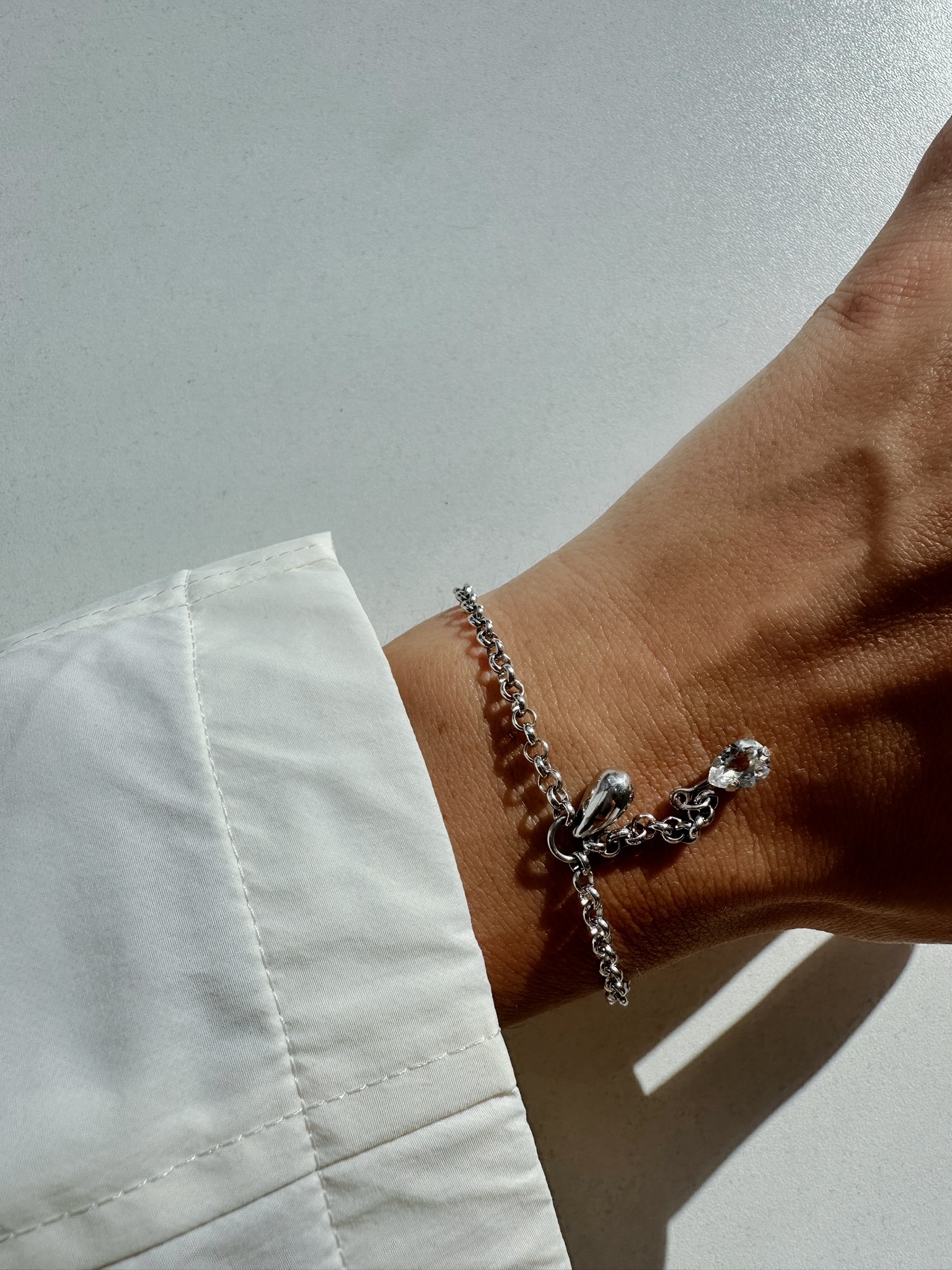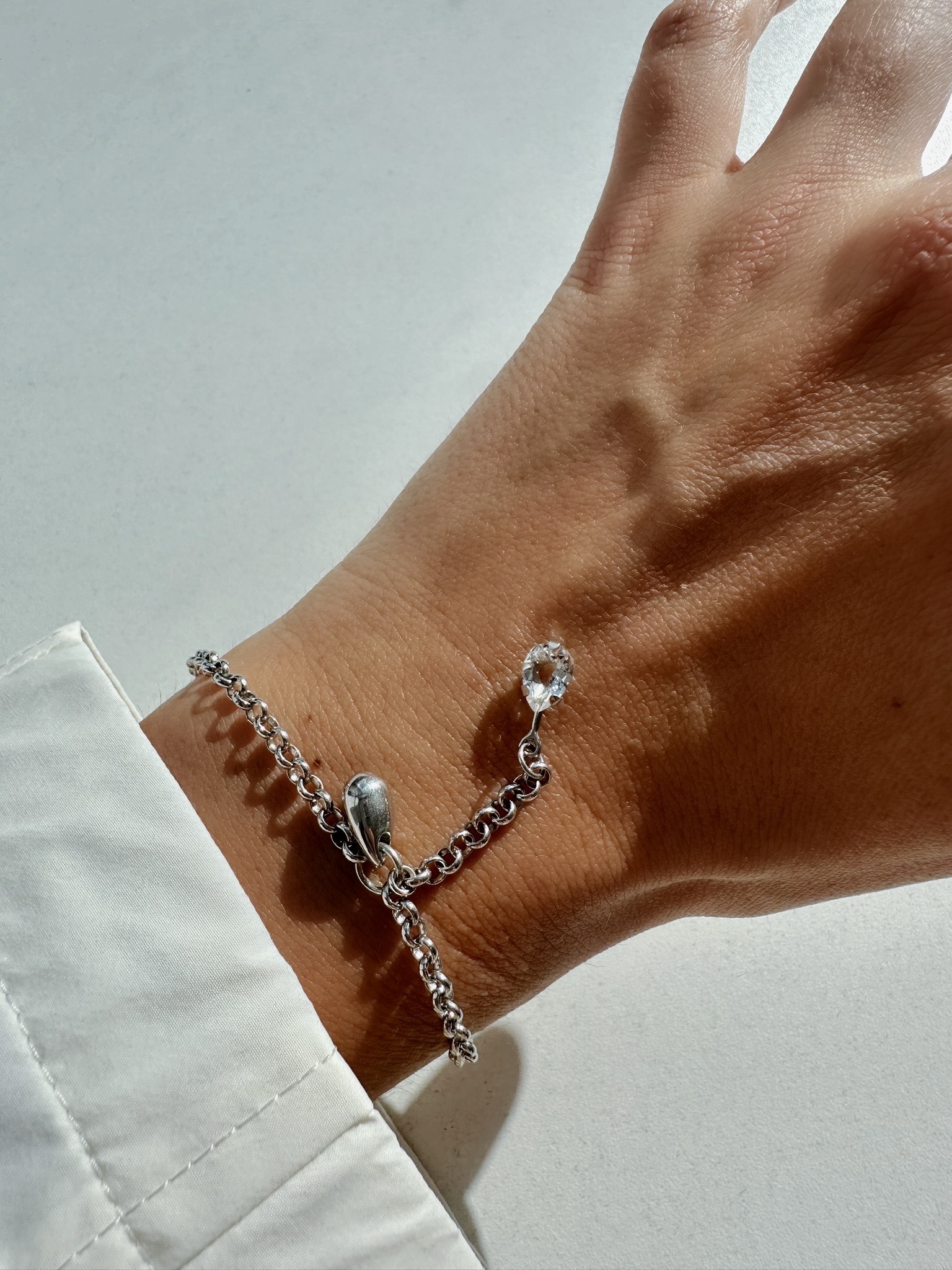 «Поймали» маленькую серебряную и хрупкую хрустальную капли на цепочку, чтобы получить лаконичный браслет — идеальное украшение на каждый день.