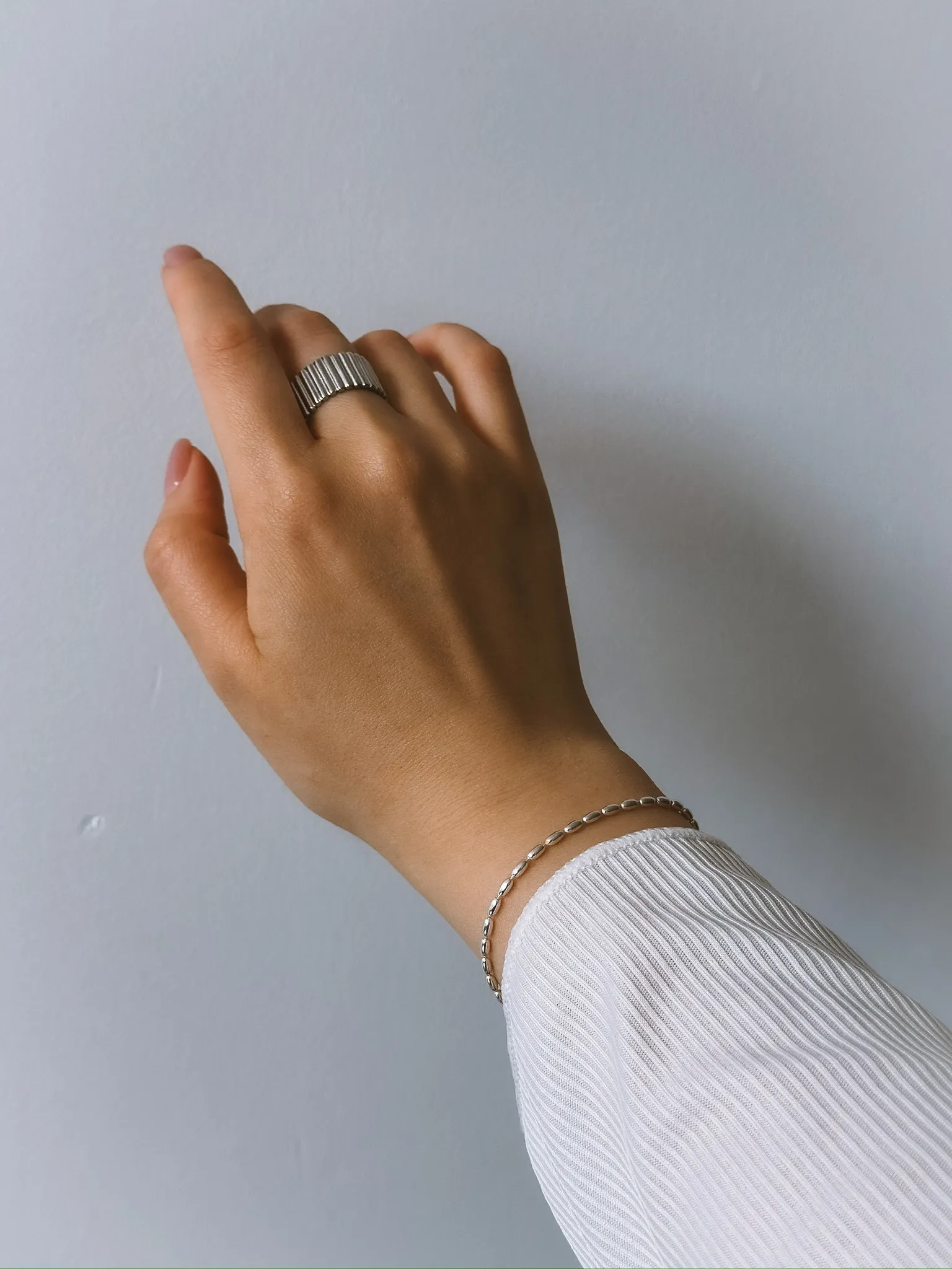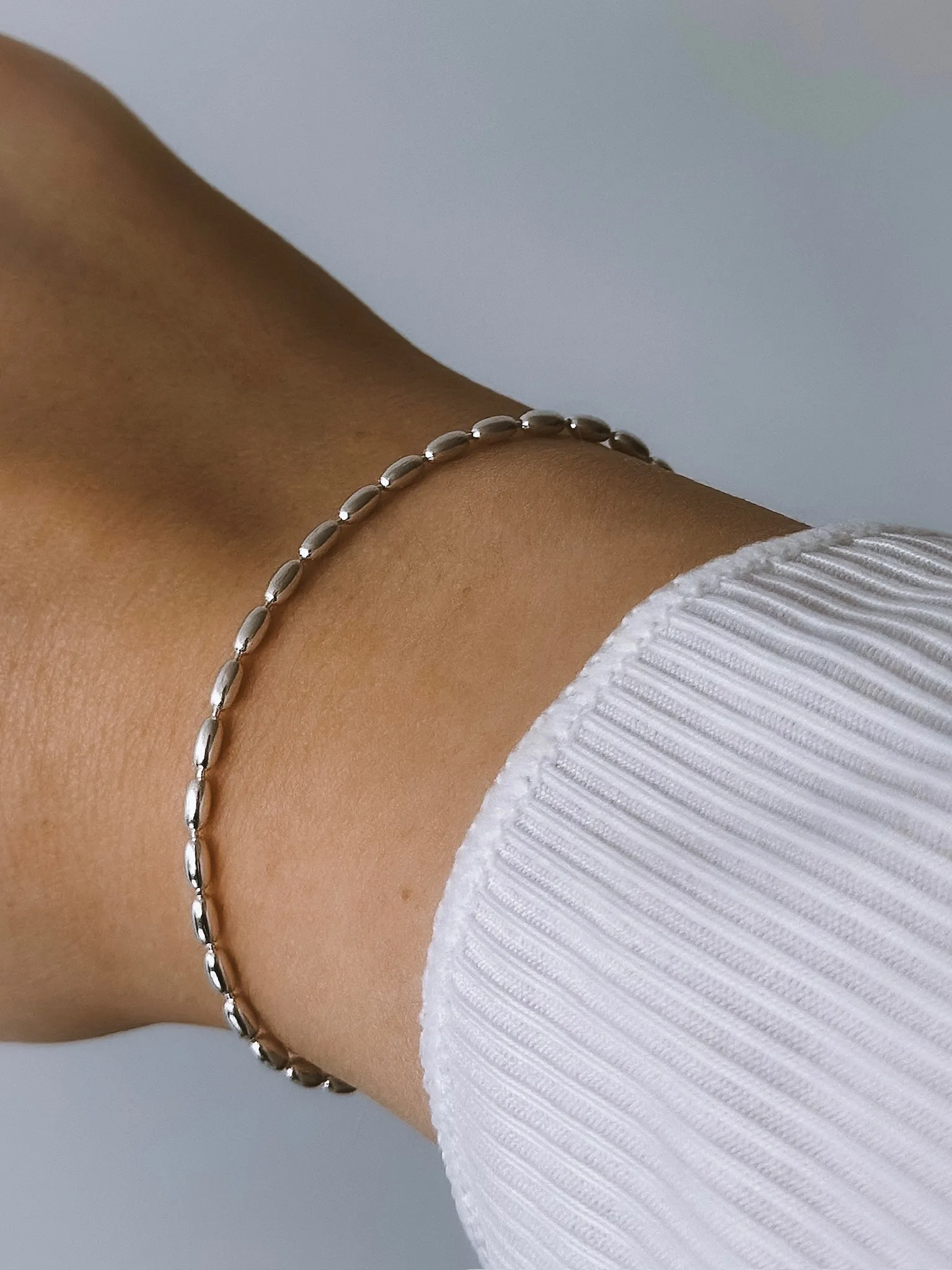 Вдохновились необычной формой маленьких серебряных вытянутых жемчужин и воплотили их в стильном и минималистичном браслете.
