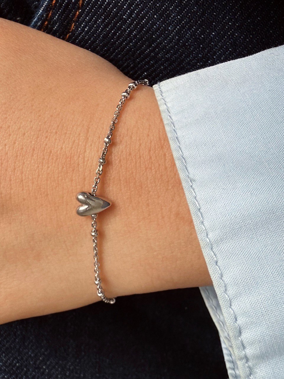 Две капли крови, которые слились в одно сердце: надели его на серебряную цепочку с игривыми шариками и превратили в лаконичный браслет, идеальный как на каждый день, так и для особого случая.